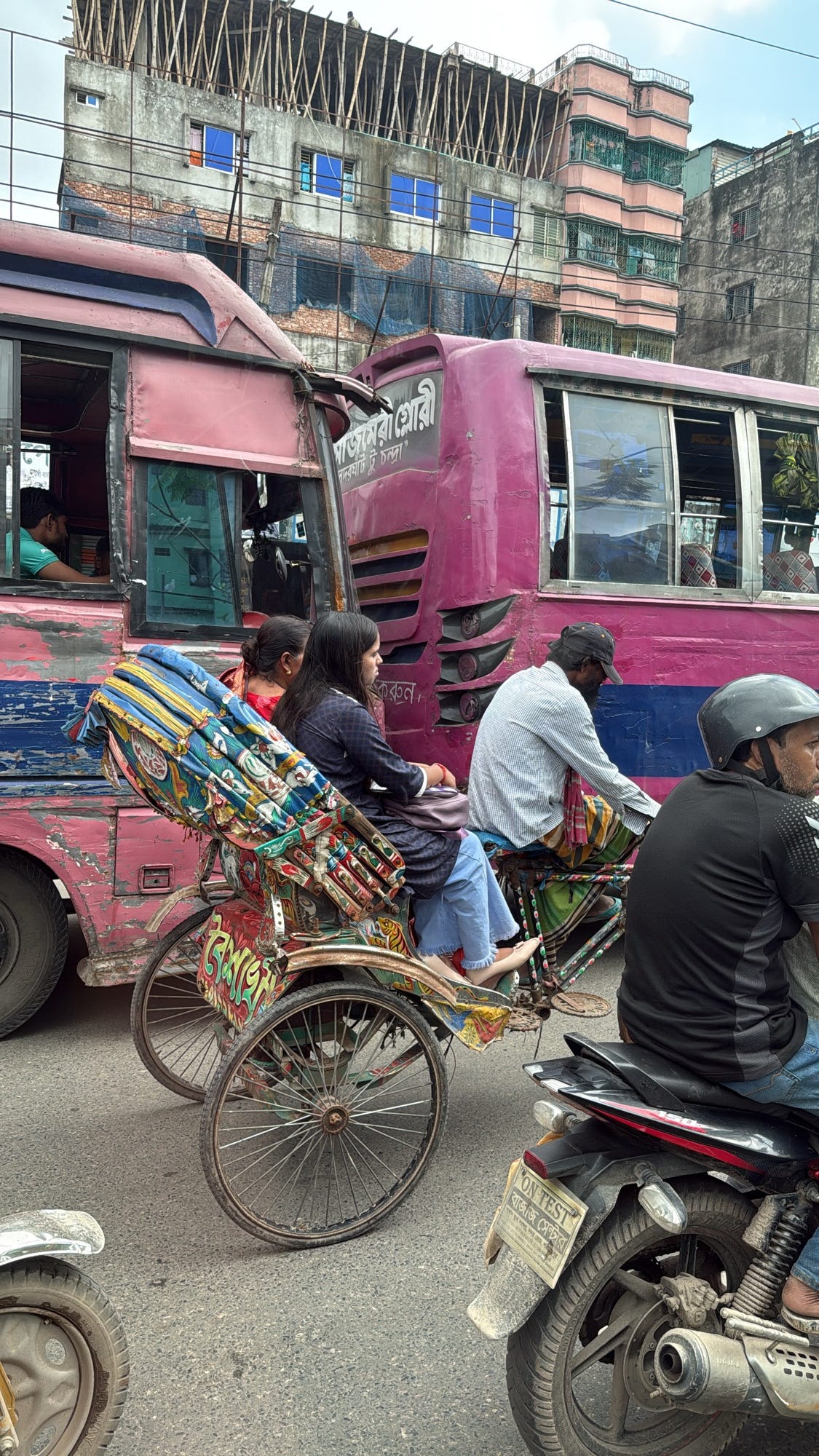 Arriving in Dhaka, all my senses were struck at once - horns blaring from cars, buses, and rickshaws stuck in endless traffic. Humidity and heat sapped my energy, vibrantly painted and decorated rickshaws competing against double-decker buses that seemed 50% repair compound. Trash is everywhere, but I struggled to find a trash can. One of the few I discovered had a massive hole in the bottom where the trash continued through to the ground.