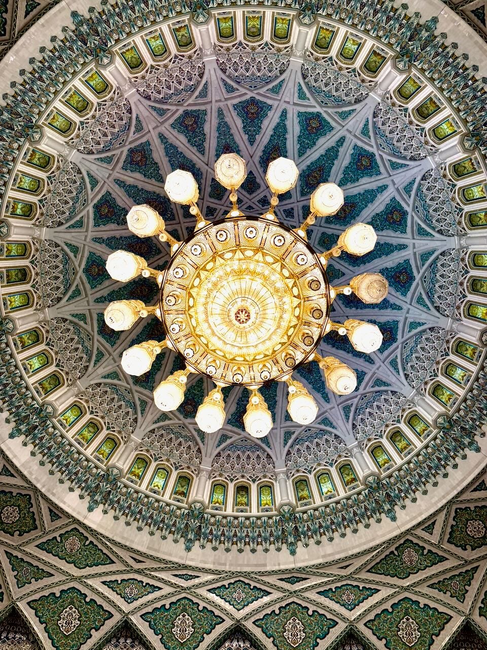 I thought about this while standing inside the Sultan Qaboos Grand Mosque, which opens to non-Muslims each morning before the Dhuhr prayer. I’ve seen ornate mosques—the tile work in Qatar, the mosaics in Istanbul—but what distinguished this one was how the elements worked together: the enormous blue rug stretching across the prayer hall, the contemporary Islamic styling of the arches, the way the color scheme of the interior dome played against rich wood panels. Around the exterior, niches paid homage to other Islamic art traditions—Persian, Turkish, Moroccan—without mimicking them. It felt less like a monument to wealth than a carefully considered space that honored both tradition and the present moment.