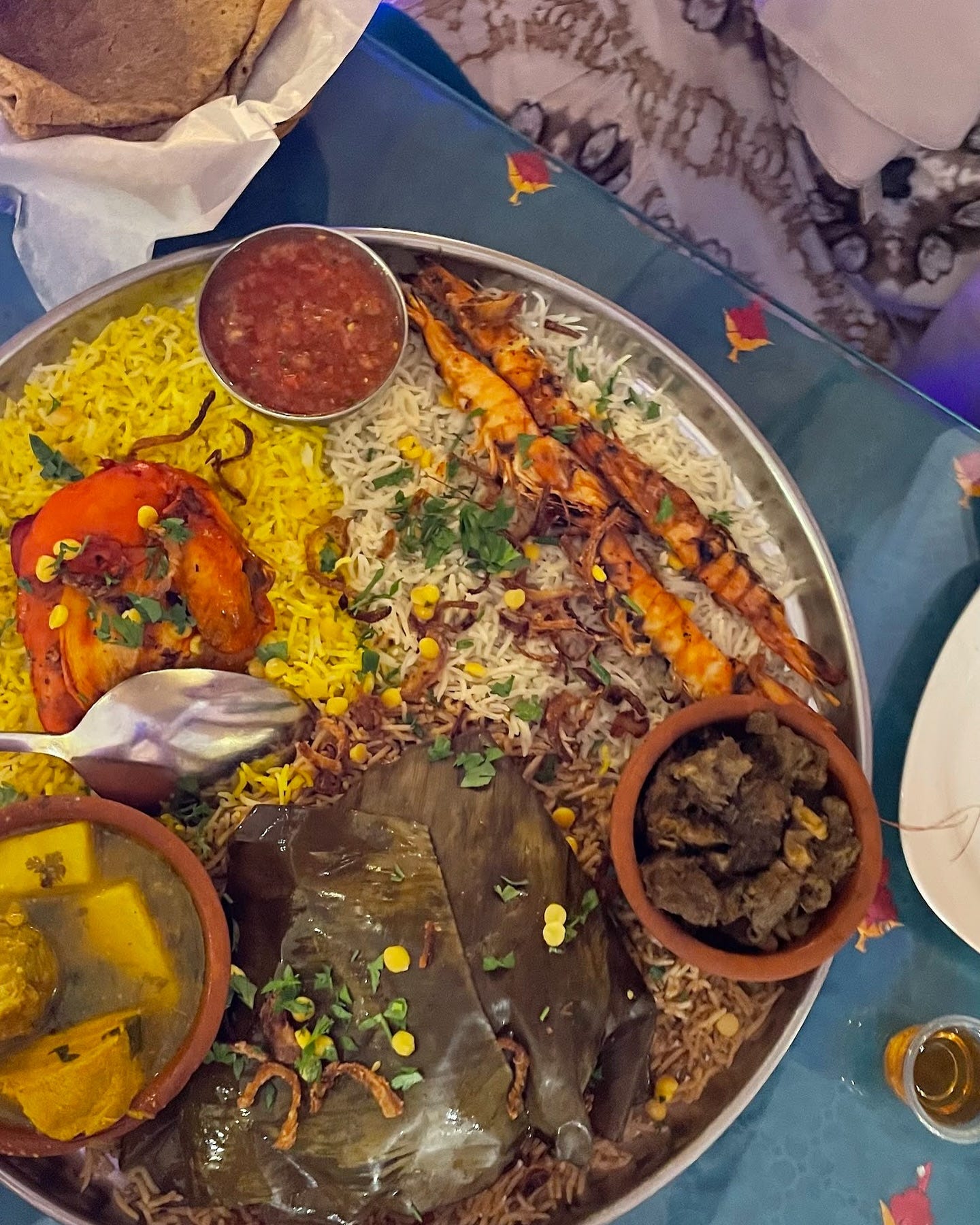 That night I ate at Ramssa, a traditional Omani restaurant where I sat on carpeted floor cushions in a booth while staff laid down plastic sheeting to protect the rugs. The starters came first: hummus, baba ghanouj, muhammara thick with roasted red peppers and walnuts, arugula salad scattered with pomegranate seeds. Then the mains: camel miqlay cooked with spices and served with honey and local bread; chicken mandi over biryani rice; lamb shiwa—marinated meat slow-roasted for days, traditionally in underground ovens—with qaboli rice studded with raisins and chickpeas; fish bablo, a stew flavored with dried lime and turmeric; shrimp mishkak grilled on skewers and served in tangy tamarind sauce. For dessert, luqaimat—crunchy fried dough balls crisp on the outside, soft within, drizzled with date molasses—and milk pudding topped with sweetened vermicelli. The meal ended with Omani coffee, kahwa, cardamom and saffron-scented, served in small cups.