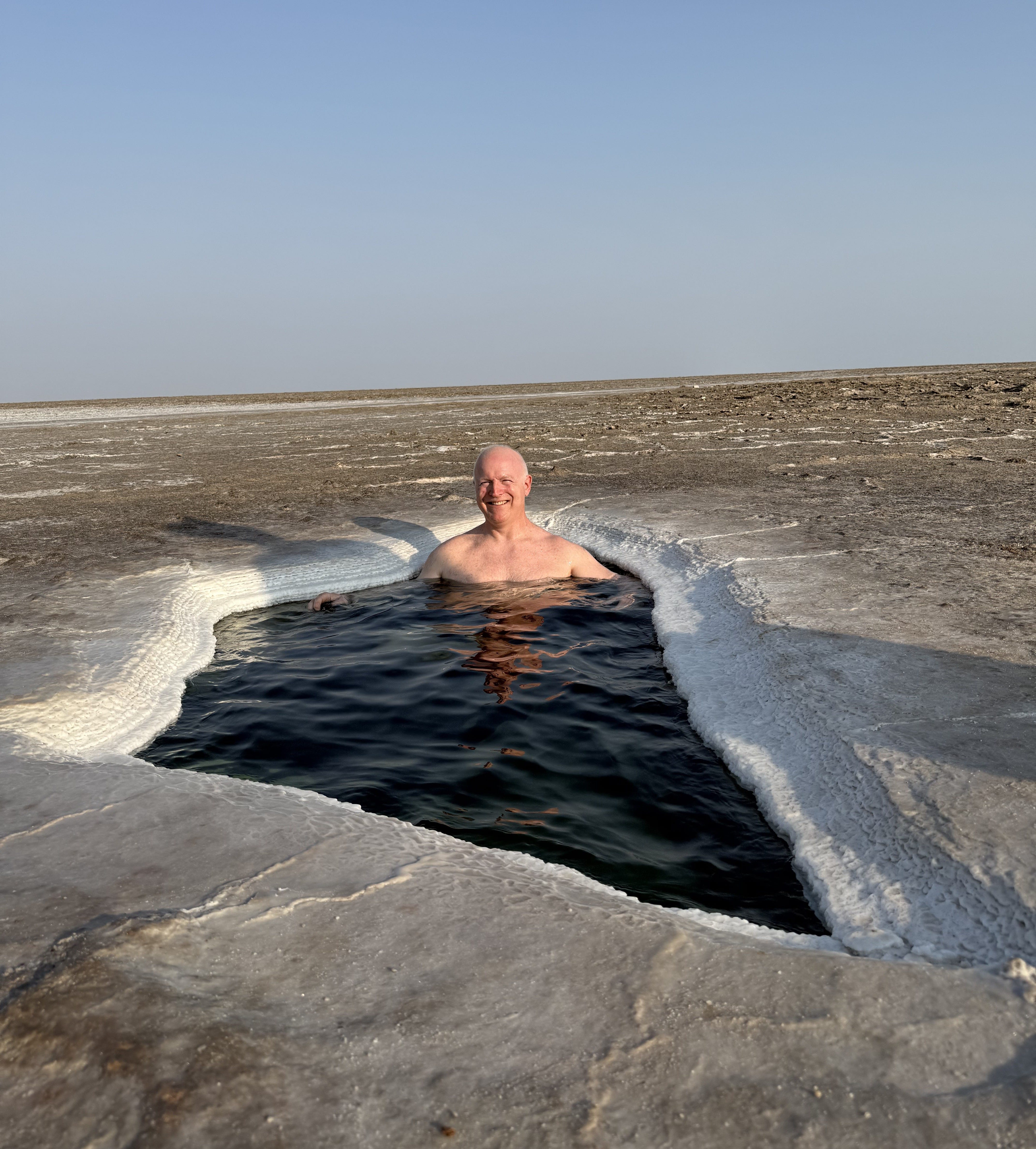 The salt defines this place. We stopped at Lake Afrera, 112 meters below sea level, which sat there like a wound in the earth—deep emerald green, fed by scalding hot springs. I swam for a few minutes in warm water four times saltier than the ocean, slick against my skin like oil. In the center of the lake sat the lowest-lying island on the planet, a tiny speck of rock in a basin of brine.