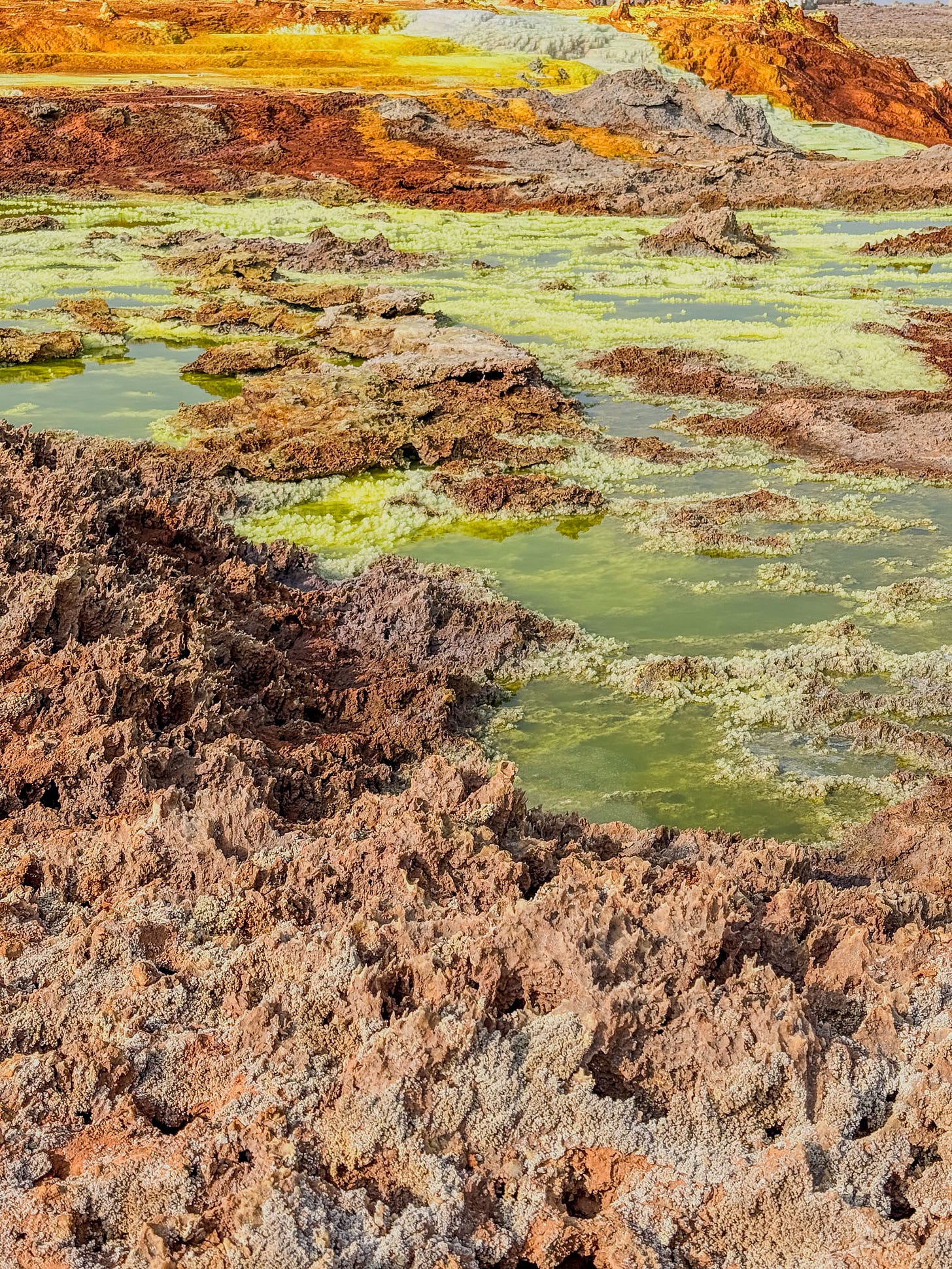 Then Dallol itself: a hydrothermal field of neon yellows, electric greens, rust reds. Boiling water vented through pillars of salt and sulfur. There were no railings, no signs, no shade. The smell of rotten eggs hung in the air, and the earth hissed. It was a landscape of pure chemistry—beautiful and hostile. It was beautiful and horrific, smelling like death and danger. Standing there, the geopolitics of the highlands seemed like something from another planet. Here, the only laws were heat and the slow, inevitable movement of tectonic plates. Geology doesn’t take sides. The land shifts because it has to. The people, maybe, don’t.